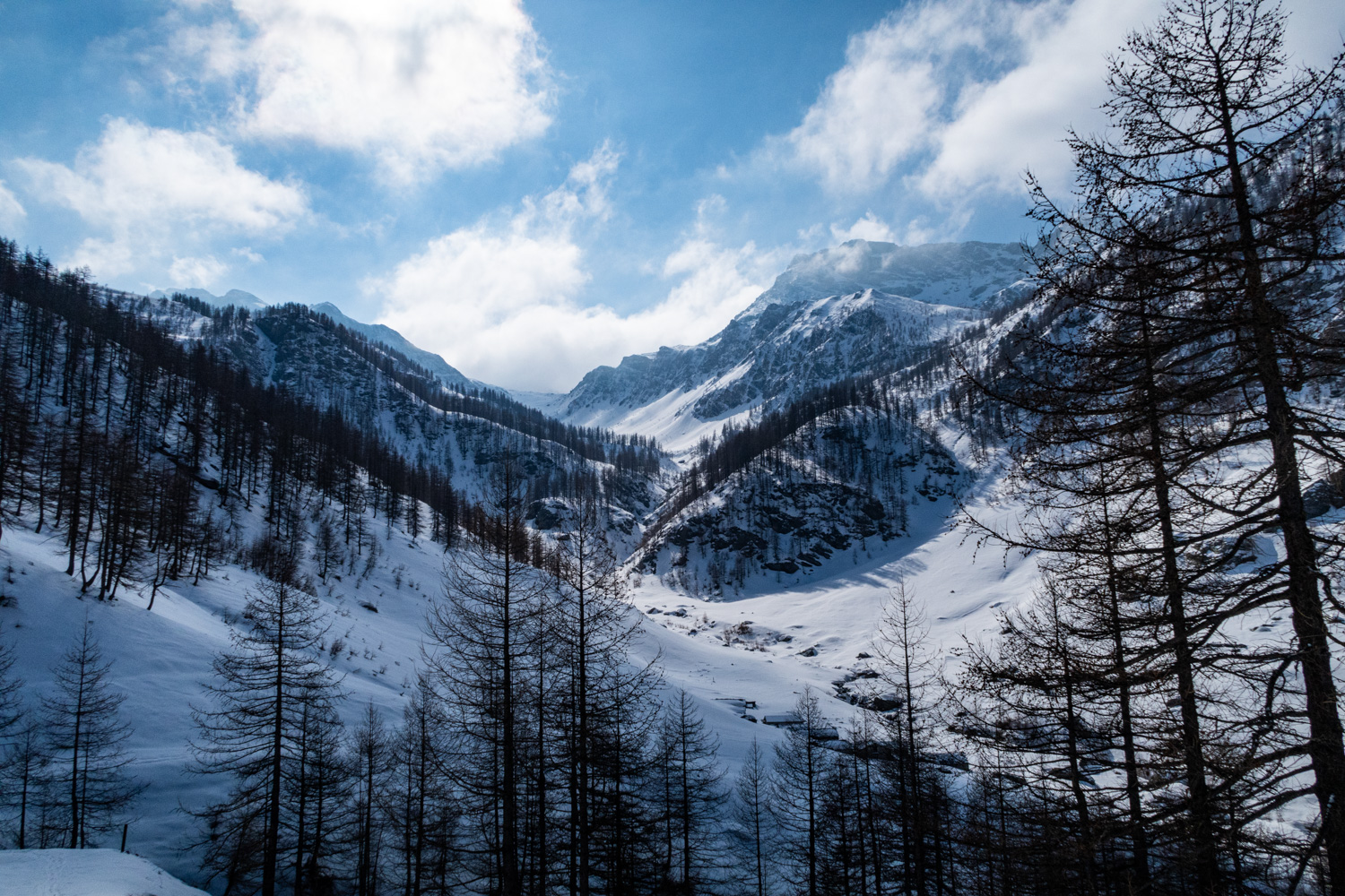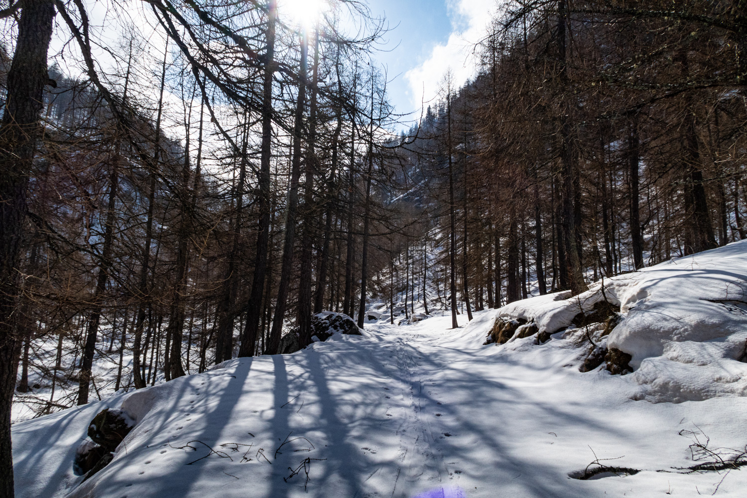 Dal ponte di Pralapia (o dove si riesce ad arrivare a seconda dell’innevamento) si segue la strada per il Barbara con possibili tagli tra i primi tornanti dopo il ponte.